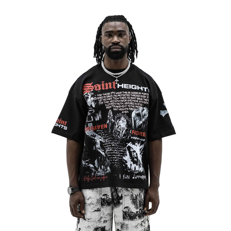 The Only God Can Judge Me tee blends spiritual text, hand-drawn angels and warriors, distressed scripture, and bold red Saint Heights branding. It feels like armor ‚a graphic built for those who walk with conviction, flaws and all.